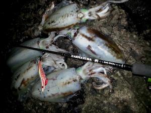 | Comment | 4号も軽くシャクれる斬76は手首や肩にも負担が少なく大きいエギもキッチリ動かしてくれる ので体が楽です♫ 若狭湾も水温低下と荒れる日が続き、シーズンOFFもあと少しなんで更にいい結果が出せるよう にがんばりまぁーす(^O^) |